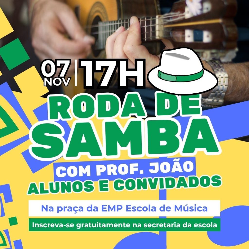 Vem celebrar a música com a gente! No dia 07 de Novembro, às 17h, a praça da EMP Escola de Música vai ser tomada pelo som contagiante do samba! 🪕