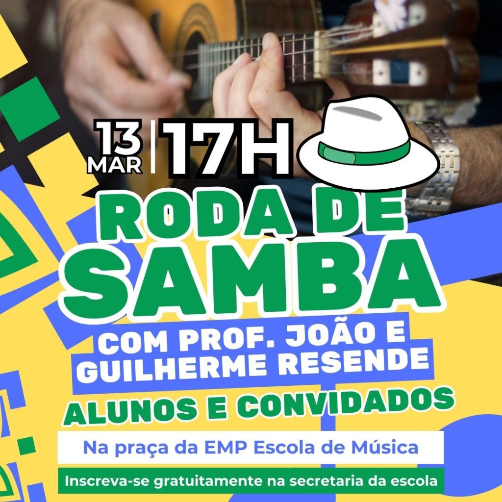 Vem celebrar a música com a gente! No dia 13 de março, às 17h, a praça da EMP Escola de Música vai ser tomada pelo som contagiante do samba! 🪕